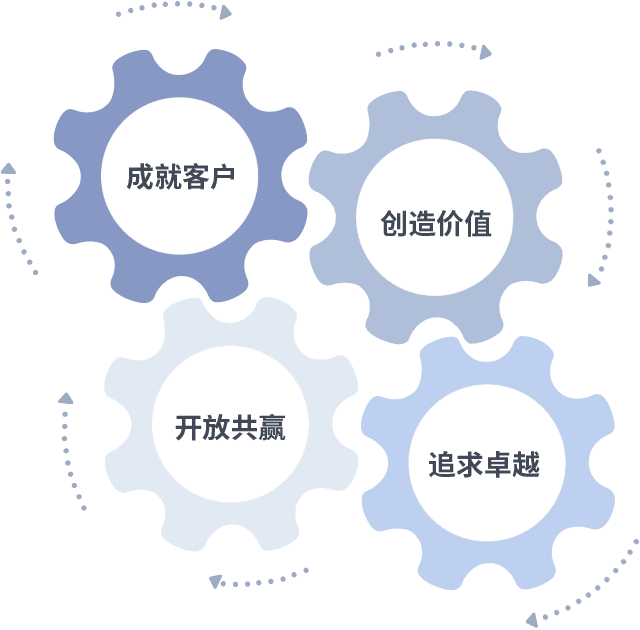 成就客户是一切决策的出发点,,,,创造价值是衡量所有工作的标准,,,追求卓越是我们做事做人的态度,,,开放共赢是我们的格局也是最终的结果。。。。价值观的齿轮环环相扣,,推动着组织里的每个人不断向前。。。。